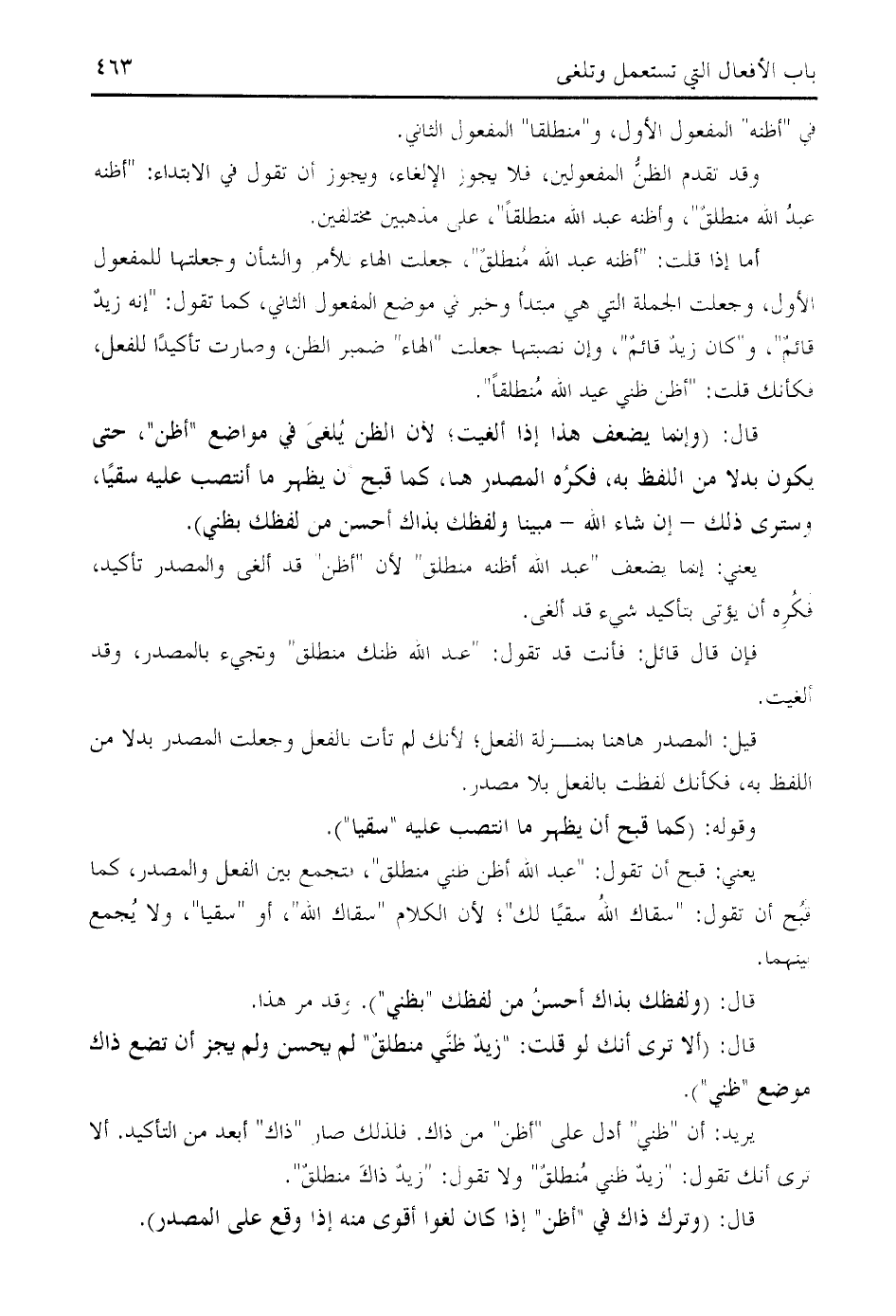 قال: (وإنما يضعف هذا إذا ألغيت؛ لأن الظن يلغى في مواضع " أظن "، حتى يكون بدلا من اللفظ به، فكره المصدر هنا، كما قبح أن يظهر ما أنتصب عليه سقيا، وسترى ذلك- إن شاء الله- مبنيا ولفظك بذاك أحسن من لفظك بظني).