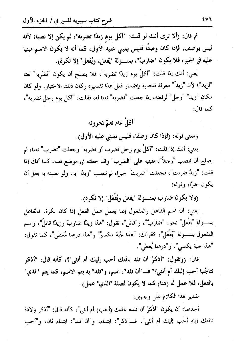ثم قال: (ألا ترى أنك لو قلت: " أكل يوم زيدا تضربه "، لم يكن إلا نصبا؛ لأنه ليس بوصف. فإذا كان وصفا فليس بمبني عليه الأول، كما أنه لا يكون الاسم مبنيا عليه في الخبر، فلا يكون " ضارب "، بمنزلة " يفعل، ويفعل " إلا نكرة).