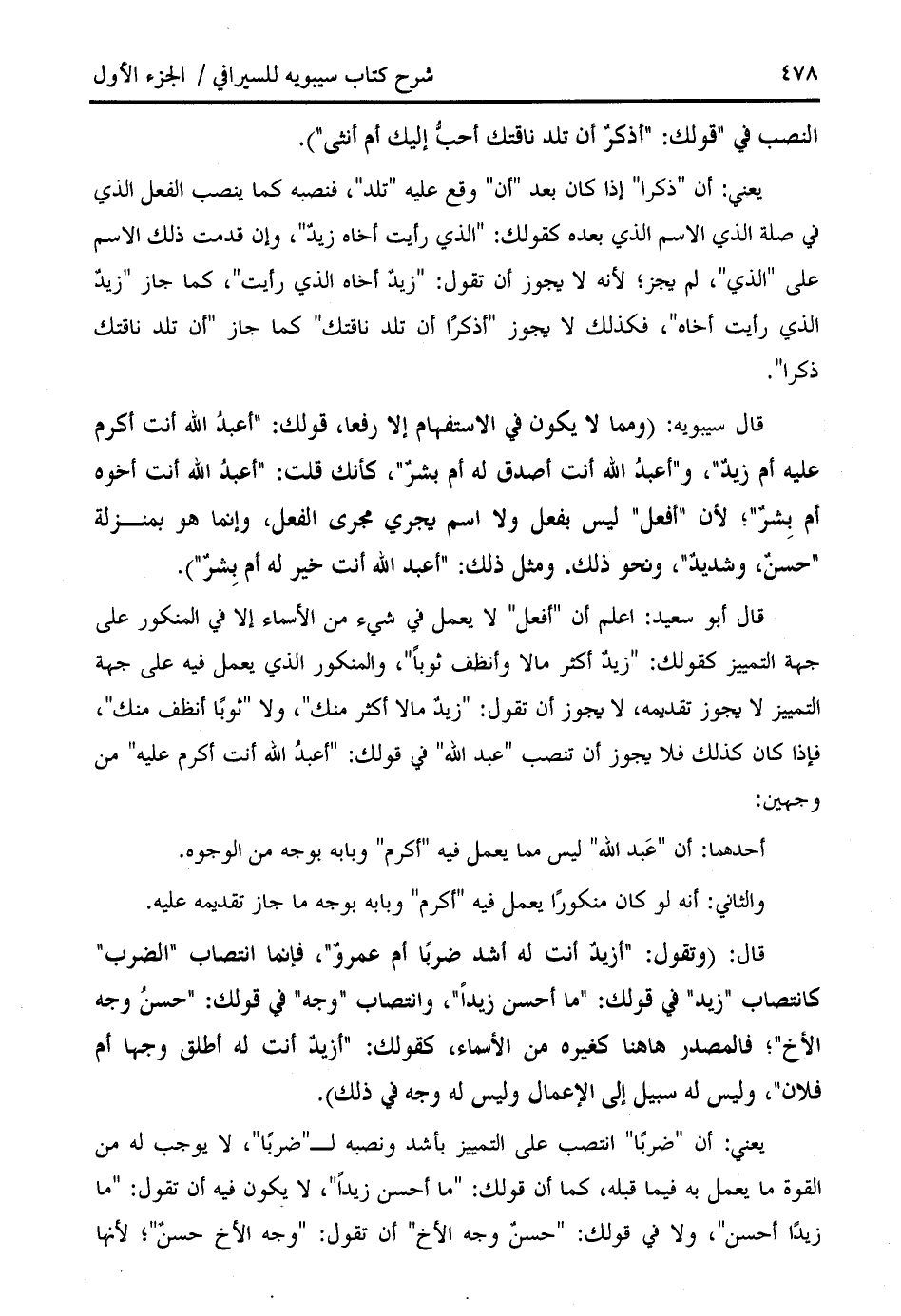 قال أبو سعيد: اعلم أن " أفعل " لا يعمل في شيء من الأسماء إلا في المنكور على جهة التمييز كقولك: " زيد أكثر مالا وأنظف ثوبا "، والمنكور الذي يعمل فيه على جهة التمييز لا يجوز تقديمه، لا يجوز أن تقول: " زيد مالا أكثر منك "، ولا " ثوبا أنظف منك "، فإذا كان كذلك فلا يجوز أن تنصب " عبد الله " في قولك: " أعبد الله أنت أكرم عليه " من وجهين: