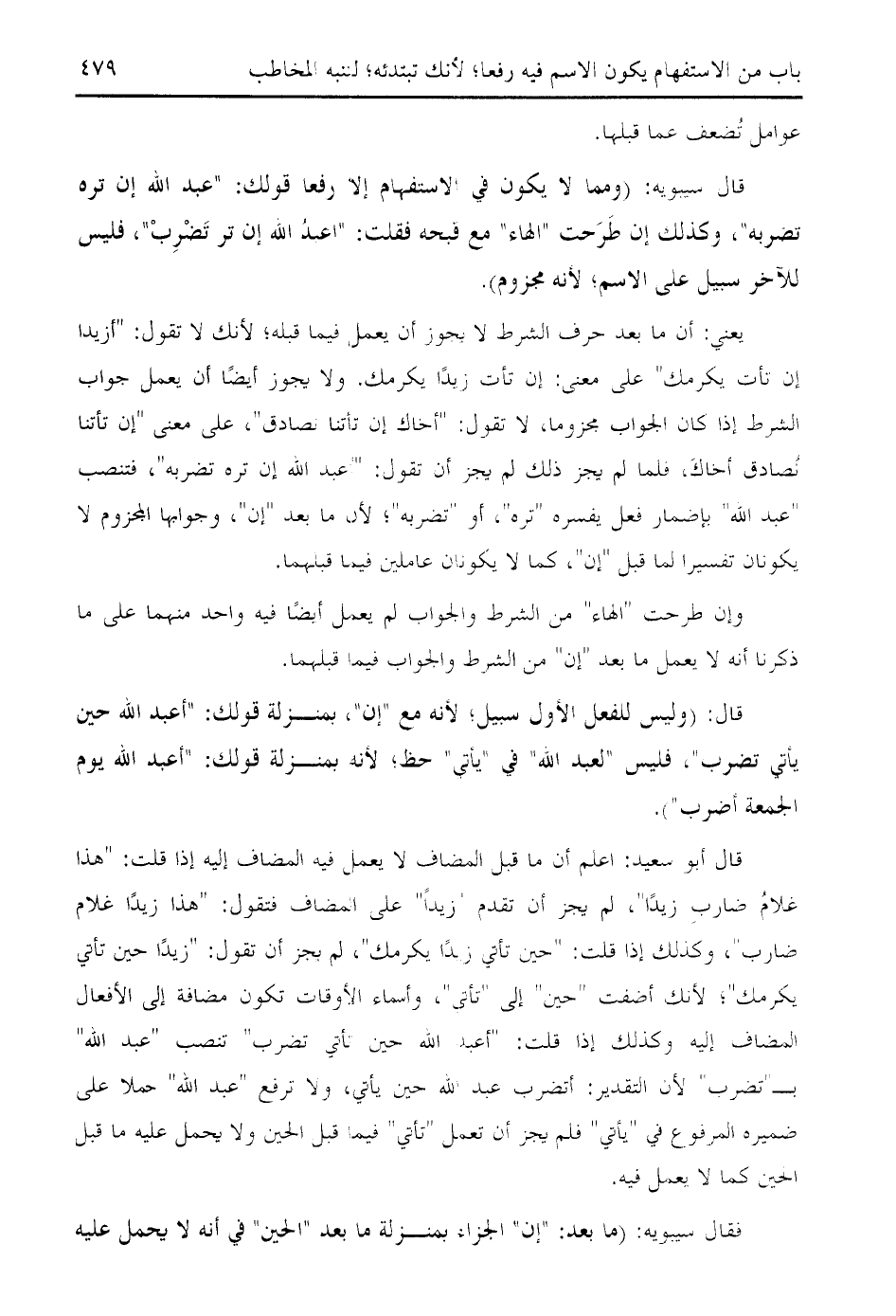قال: (وليس للفعل الأول سبيل؛ لأنه مع " إن "، بمنزلة قولك: " أعبد الله حين يأتي تضرب "، فليس " لعبد الله " في " يأتي " حظ؛ لأنه بمنزلة قولك: " أعبد الله يوم الجمعة أضرب ").