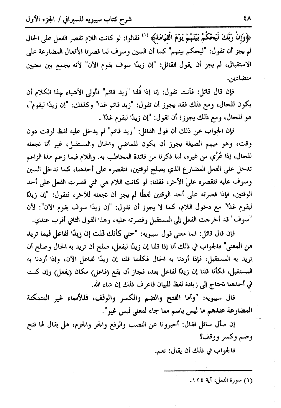 وَإِنَّ رَبَّكَ لَيَحْكُمُ بَيْنَهُمْ يَوْمَ الْقِيامَةِ (¬1) فقالوا: لو كانت اللام تقصر الفعل على الحال لم يجز أن تقول: " ليحكم بينهم " كما أن السين وسوف لما قصرتا الأفعال المضارعة على الاستقبال، لم يجز أن يقول القائل: " إن زيدا سوف يقوم الآن " لأنه يجمع بين معنيين متضادين.