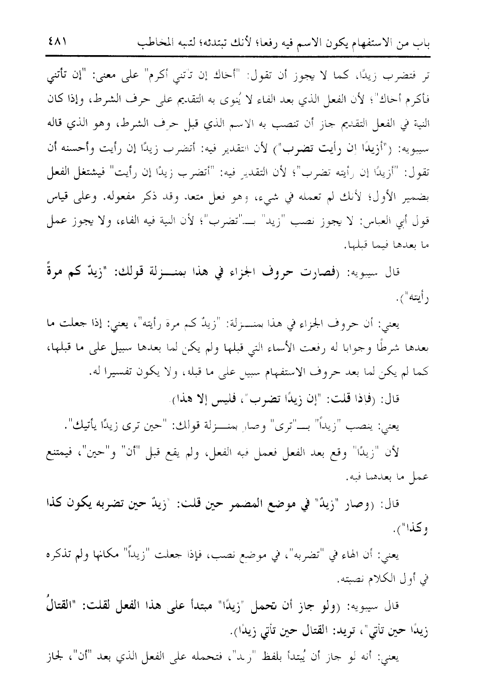 تر فتضرب زيدا، كما لا يجوز أن تقول: " أخاك إن تأتني أكرم " على معنى: " إن تأتني فأكرم أخاك "؛ لأن الفعل الذي بعد الفاء لا ينوى به التقديم على حرف الشرط، وإذا كان النية في الفعل التقديم جاز أن تنصب به الاسم الذي قبل حرف الشرط، وهو الذي قاله سيبويه: (" أزيدا إن رأيت تضرب ") لأن التقدير فيه: أتضرب زيدا إن رأيت وأحسنه أن تقول: " أزيدا إن رأيته تضرب "؛ لأن التقدير فيه: " أتضرب زيدا إن رأيت " فيشتغل الفعل بضمير الأول؛ لأنك لم تعمله في شيء، وهو فعل متعد وقد ذكر مفعوله. وعلى قياس قول أبي العباس: لا يجوز نصب " زيد " ب " تضرب "؛ لأن النية فيه الفاء، ولا يجوز عمل ما بعدها فيما قبلها.