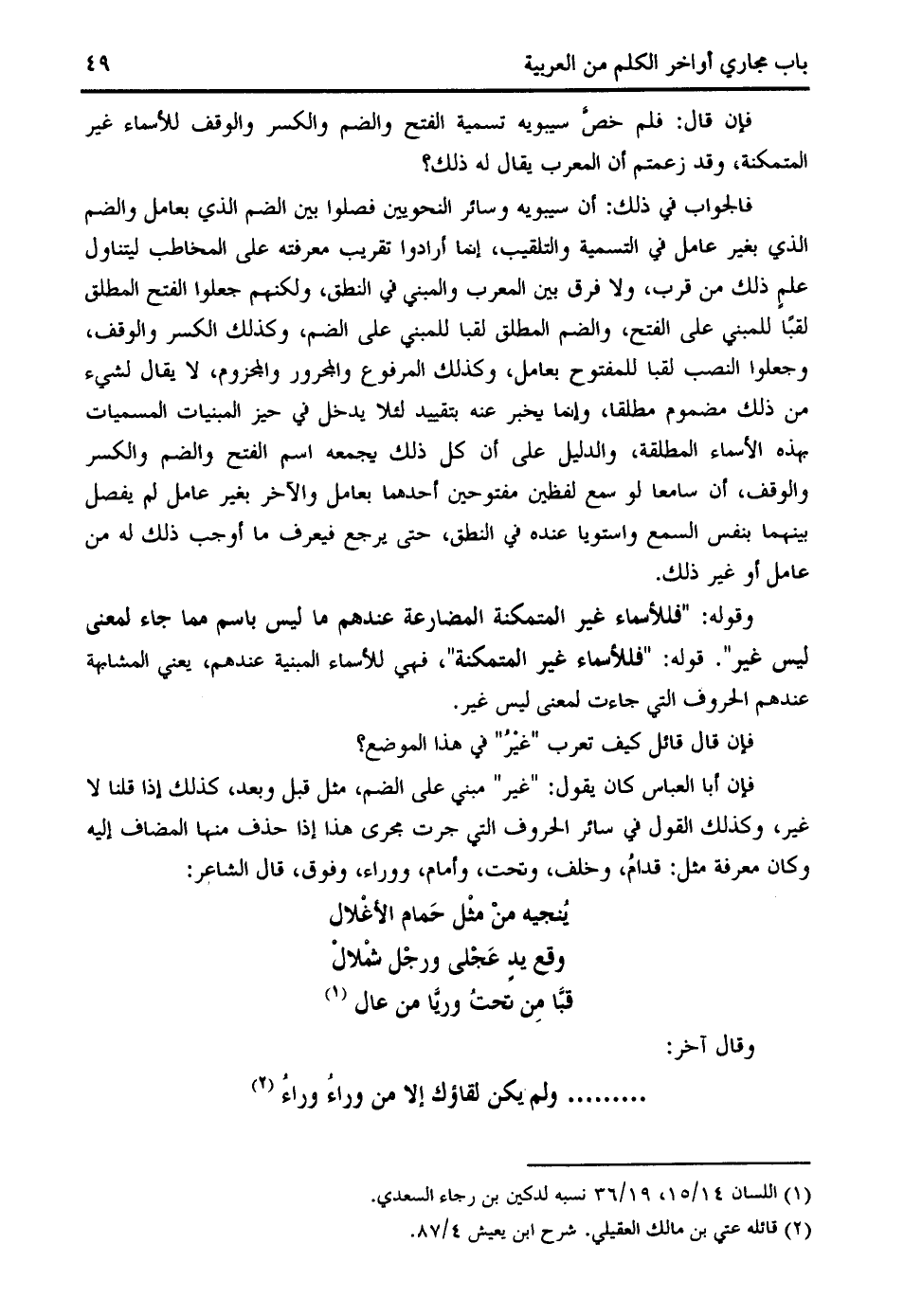 وقوله: " فللأسماء غير المتمكنة المضارعة عندهم ما ليس باسم مما جاء لمعنى ليس غير ". قوله: " فللأسماء غير المتمكنة "، فهي للأسماء المبنية عندهم، يعني المشابهة عندهم الحروف التي جاءت لمعنى ليس غير.