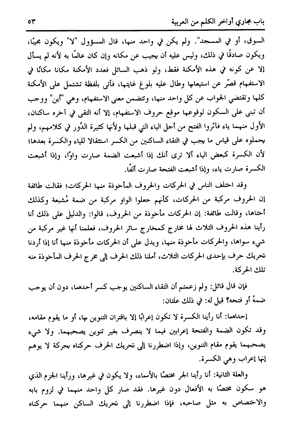 والعلة الثانية: أنا رأينا الجر مختصا بالأسماء، ولا يكون في غيرها، ورأينا الجزم الذي هو سكون مختصا به الأفعال دون غيرها. فقد صار كل واحد منهما في لزوم بابه والاختصاص به مثل صاحبه، فإذا اضطررنا إلى تحريك الساكن منهما حركناه