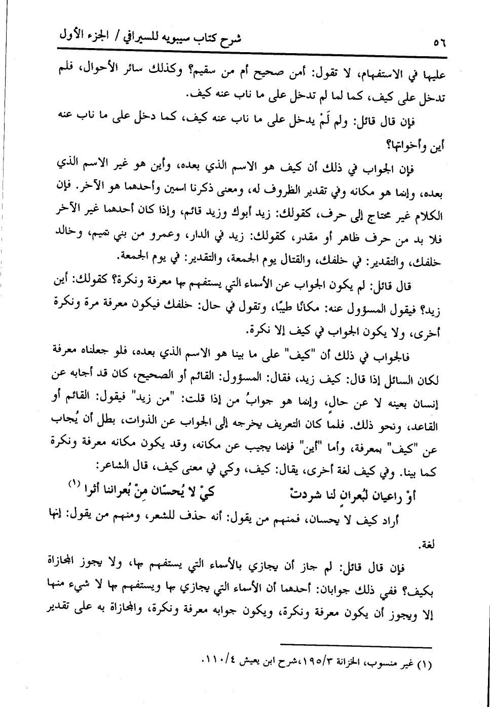 فإن الجواب في ذلك أن كيف هو الاسم الذي بعده، وأين هو غير الاسم الذي بعده، وإنما هو مكانه وفي تقدير الظروف له، ومعنى ذكرنا اسمين وأحدهما هو الآخر. فإن الكلام غير محتاج إلى حرف، كقولك: زيد أبوك وزيد قائم، وإذا كان أحدهما غير الآخر فلا بد من حرف ظاهر أو مقدر، كقولك: زيد في الدار، وعمرو من بني تميم، وخالد خلفك، والتقدير: في خلفك، والقتال يوم الجمعة، والتقدير: في يوم الجمعة.
