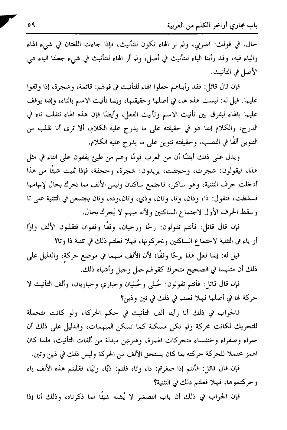 فإن قال قائل: فقد رأيناهم جعلوا الهاء للتأنيث في قولهم: قائمة، وشجرة، إذا وقفوا عليها. قيل له: ليست هذه هاء في أصلها وحقيقتها، وإنما تأنيث الاسم بالتاء، وإنما يوقف عليها بالهاء ليفرق بين تأنيث الاسم وتأنيث الفعل، وأيضا فإن هذه الهاء تنقلب تاء في الدرج، والكلام إنما هو في حقيقته على ما يدرج عليه الكلام، ألا ترى أنا نقلب من التنوين ألفا في النصب، وحقيقته تنوين على ما يدرج عليه الكلام.