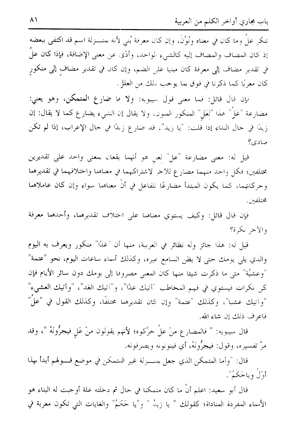 قال أبو سعيد: اعلم أنّ ما كان متمكنا في حال ثم دخلته علة أوجبت له البناء هو الأسماء المفردة المناداة؛ كقولك " يا زيد " و " يا حكم " والغايات التي تكون معربة في