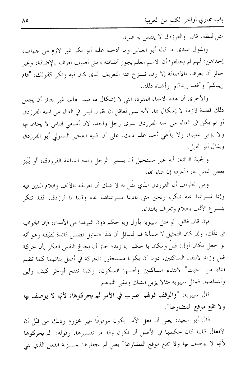 ومن الطريف أن الفرزدق الذي مثّل به لا شك أن تعريفه بالألف واللام اللتين فيه وإذا نزعتا عنه تنكر، ونحن متى نادينا نزعناهما عنه وقلنا يا فرزدق، فقد تنكر بنزع الألف واللام وتعرف بالنداء.
