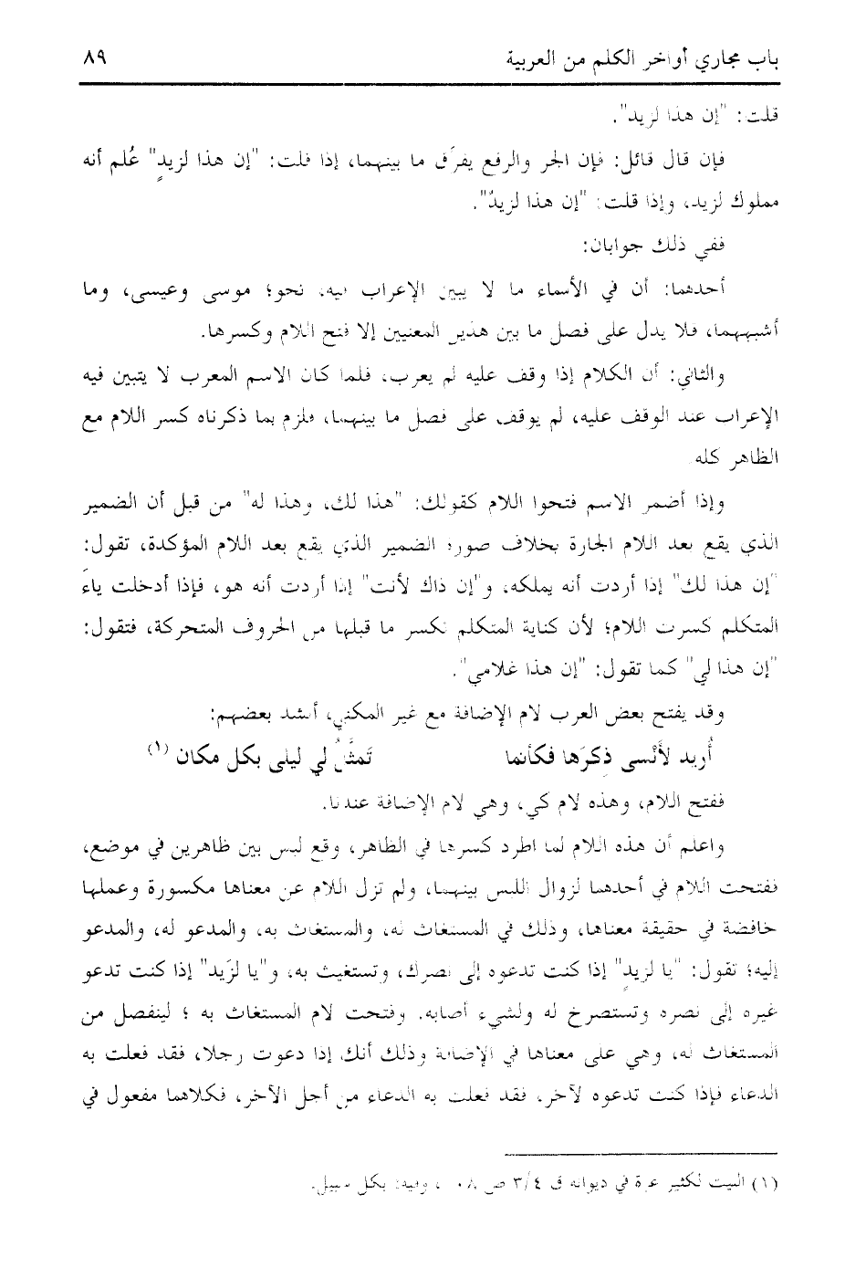 فإن قال قائل: فإن الجر والرفع يفرّق ما بينهما، إذا قلت: " إن هذا لزيد " علم أنه مملوك لزيد، وإذا قلت: " إن هذا لزيد ".