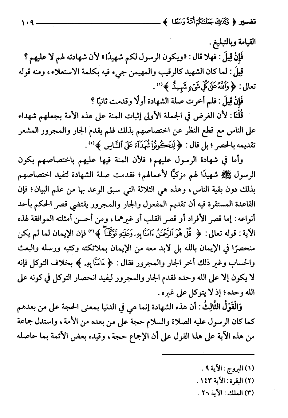 قُلْنَا: لأن الغرض في الجملة الأولى إثبات المنة على هذه الأمة بجعلهم شهداء على الناس مع قطع النظر عن اختصاصهم بذلك فلم يقدم الجار والمجرور المشعر تقديمه بالحصر؛ بل قال: {لِتَكُونُوا شُهَدَاءَ عَلَى النَّاسِ} (¬2).