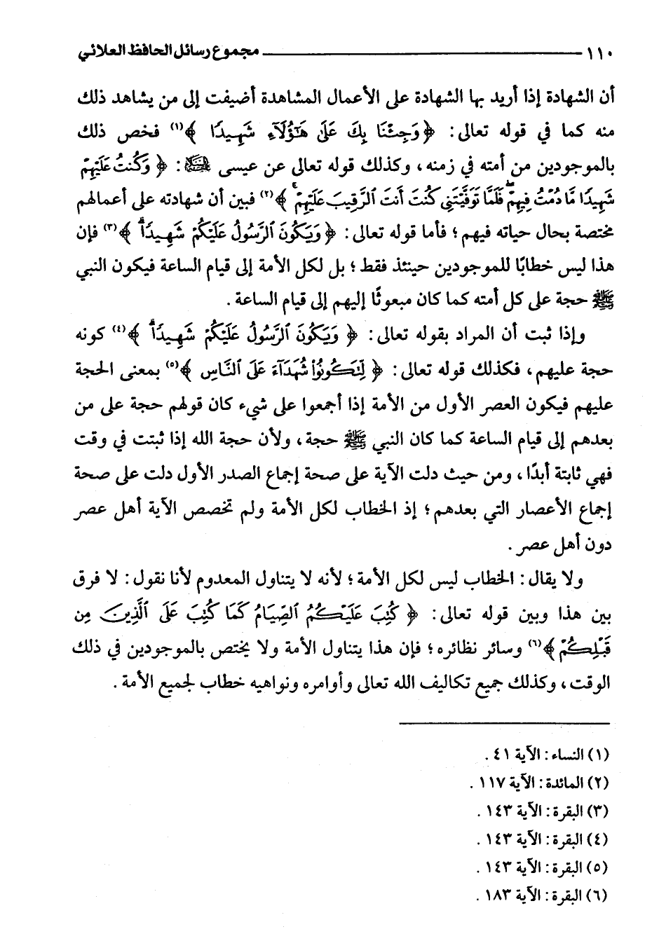 أن الشهادة إذا أريد بها الشهادة على الأعمال المشاهدة أضيفت إلى من يشاهد ذلك منه كما في قوله تعالى: {وَجِئْنَا بِكَ عَلَى هَؤُلَاءِ شَهِيدًا} (¬1) فخص ذلك بالموجودين من أمته في زمنه، وكذلك قوله تعالى عن عيسى عليه السلام: {وَكُنْتُ عَلَيْهِمْ شَهِيدًا مَا دُمْتُ فِيهِمْ فَلَمَّا تَوَفَّيْتَنِي كُنْتَ أَنْتَ الرَّقِيبَ عَلَيْهِمْ} (¬2) فبين أن شهادته على أعمالهم مختصة بحال حياته فيهم؛ فأما قوله تعالى: {وَيَكُونَ الرَّسُولُ عَلَيْكُمْ شَهِيدًا} (¬3) فإن هذا ليس خطابًا للموجودين حينئذ فقط؛ بل لكل الأمة إلى قيام الساعة فيكون النبي -صلى اللَّه عليه وسلم- حجة على كل أمته كما كان مبعوثًا إليهم إلى قيام الساعة.
