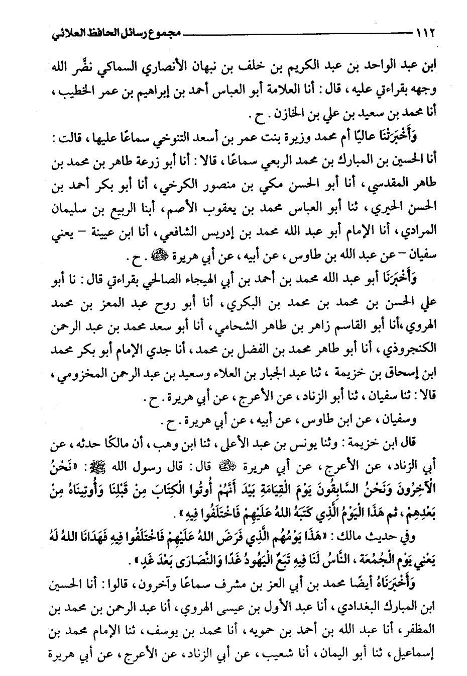 وَأَخْبَرَتنَا عاليًا أم محمد وزيرة بنت عمر بن أسعد التنوخي سماعًا عليها، قالت: أنا الحسين بن المبارك بن محمد الربعي سماعًا، قالا: أنا أبو زرعة طاهر بن محمد بن طاهر المقدسي، أنا أبو الحسن مكي بن منصور الكرخي، أنا أبو بكر أحمد بن الحسن الحيري، ثنا أبو العباس محمد بن يعقوب الاسم، أبنا الربيع بن سليمان المرادي، أنا الإِمام أبو عبد اللَّه محمد بن إدريس الشافعي، أنا ابن عيينة -يعني سفيان- عن عبد اللَّه بن طاوس، عن أبيه، عن أبي هريرة -رضي اللَّه عنه-. ح.