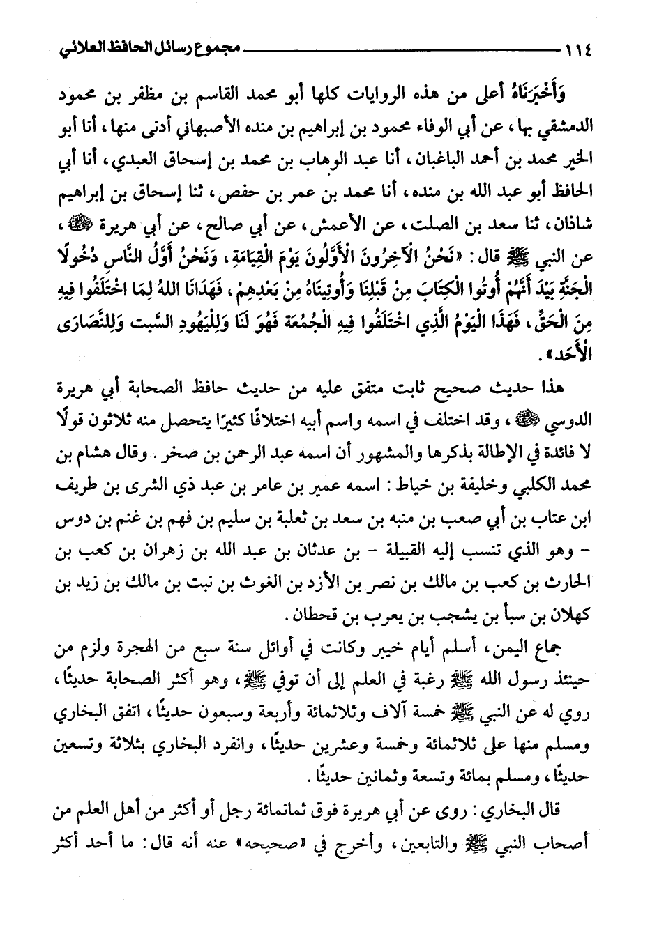 وَأَخْبَرَنَاهُ أعلى من هذه الروايات كلها أبو محمد القاسم بن مظفر بن محمود الدمشقي بها، عن أبي الوفاء محمود بن إبراهيم بن منده الأصبهاني أدنى منها، أنا أبو الخير محمد بن أحمد الباغبان، أنا عبد الوهاب بن محمد بن إسحاق العبدي، أنا أبي الحافظ أبو عبد اللَّه بن منده، أنا محمد بن عمر بن حفص، ثنا إسحاق بن إبراهيم شاذان، ثنا سعد بن الصلت، عن الأَعمش، عن أبي صالح، عن أبي هريرة -رضي اللَّه عنه-, عن النبي -صلى اللَّه عليه وسلم- قال: "نَحْنُ الآخِرُونَ الأَوَّلُونَ يَوْمَ الْقِيَامَةِ، وَنَحْنُ أَوَّلُ النَّاسِ دُخُولًا الْجَنَّة بَيْدَ أَنَّهُمْ أُوتُوا الْكِتَابَ مِنْ قَبْلِنَا وَأُوتِينَاهُ مِنْ بَعْدِهِمْ، فَهَدَانَا اللَّهُ لِمَا اخْتَلَفُوا فِيهِ مِنَ الْحَقِّ، فَهَذَا الْيَومُ الَّذِي اخْتَلَفُوا فِيهِ الْجُمُعَة فَهُوَ لنَا وَلِلْيَهُودِ السَّبت وَلِلنَّصَارَى الأَحَد".