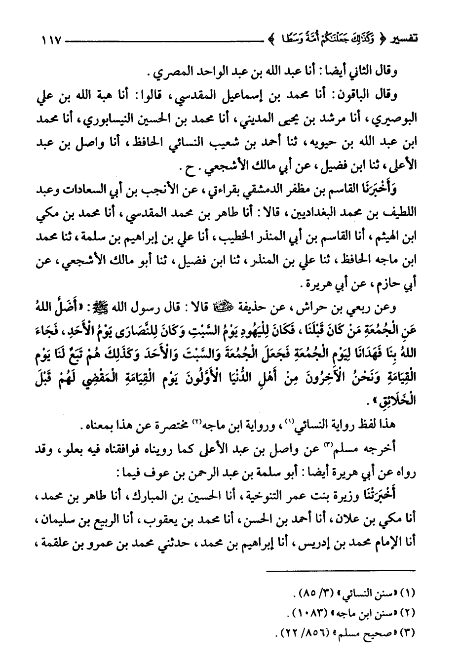 وعن ربعي بن حراش، عن حذيفة -رضي اللَّه عنهما- قالا: قال رسول اللَّه -صلى اللَّه عليه وسلم-: "أَضَلَّ اللَّهُ عَنِ الْجُمُعَةِ مَنْ كَانَ قَبْلَنَا، فكَانَ لِلْيَهُودِ يَوْمُ السَّبتِ وَكَانَ لِلنَّصَارَى يَوْمُ الأَحَدِ، فَجَاءَ اللَّهُ بِنَا فَهَدَانَا لِيَوْمِ الْجُمُعَةِ فَجَعَلَ الْجُمُعَةَ وَالسَّبْتَ وَالأَحَدَ وَكَذَلِكَ هُمْ تَبَعٌ لَنَا يَوْم الْقِيَامَةِ وَنَحْنُ الآخِرُونَ مِنْ أَهْلِ الدُّنيَا الأَوَّلُونَ يَوْم الْقِيَامَةِ الْمقْضِي لَهُمْ قَبْلَ الْخَلَائقِ".