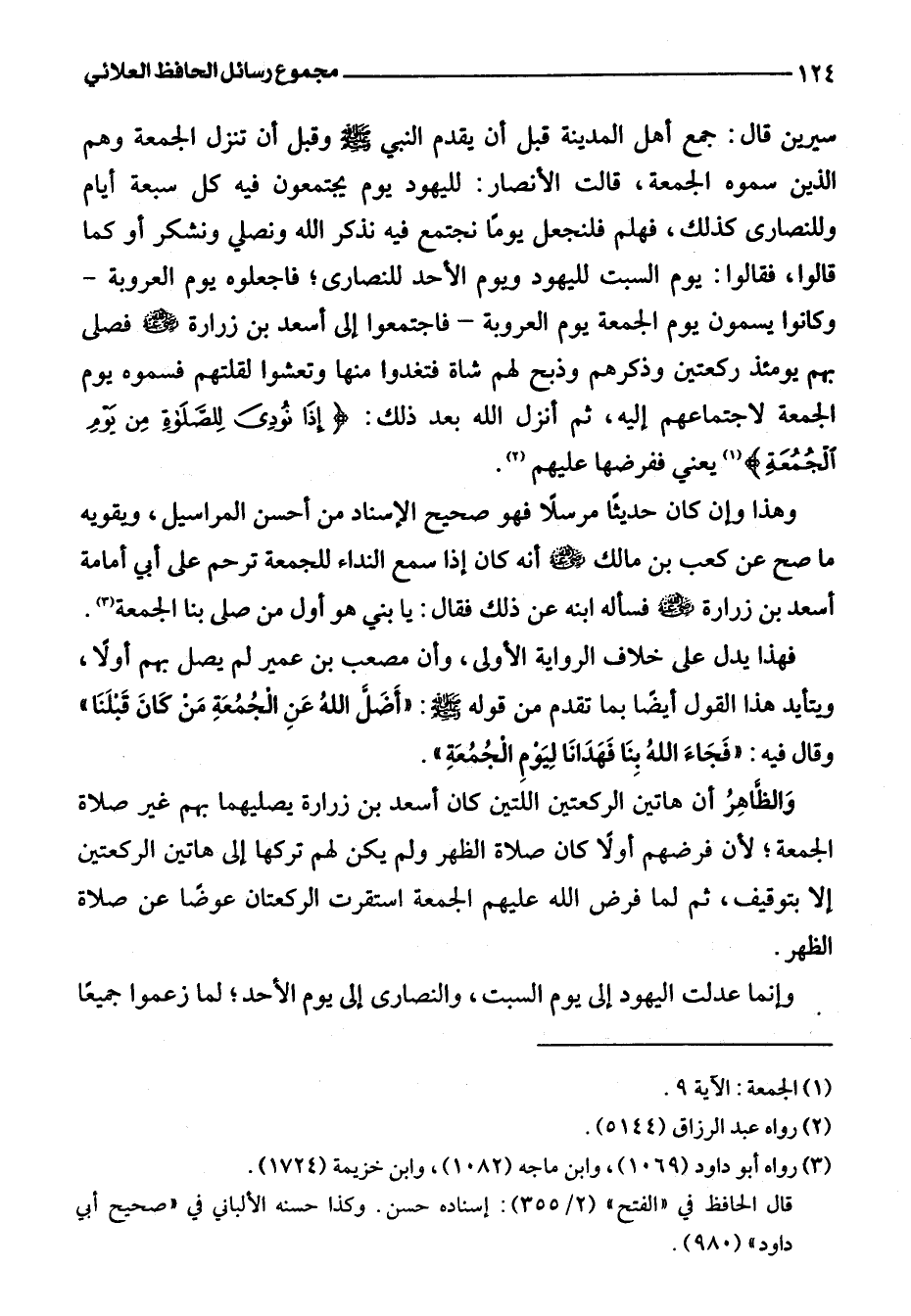 وهذا وإن كان حديثًا مرسلًا فهو صحيح الإسناد من أحسن المراسيل، ويقويه ما صح عن كعب بن مالك -رضي اللَّه عنه- أنه كان إذا سمع النداء للجمعة ترحم على أبي أمامة أسعد بن زرارة -رضي اللَّه عنه- فسأله ابنه عن ذلك فقال: يا بني هو أول من صلى بنا الجمعة (¬3).