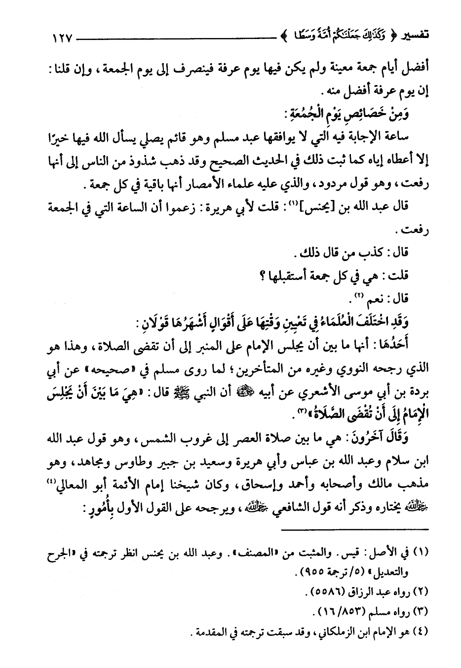 وَقَالَ آخَرُونَ: هي ما بين صلاة العصر إلى غروب الشمس، وهو قول عبد اللَّه ابن سلام وعبد اللَّه بن عباس وأبي هريرة وسعيد بن جبير وطاوس ومجاهد، وهو مذهب مالك وأصحابه وأحمد وإسحاق، وكان شيخنا إمام الأئمة أبو المعالي (¬4) رحمه اللَّه يختاره وذكر أنه قول الشافعي رحمه اللَّه، ويرجحه على القول الأول بِأُمُورٍ: