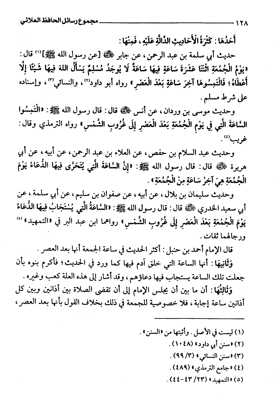 وحديث عبد السلام بن حفص، عن العلاء بن عبد الرحمن، عن أبيه، عن أبي هريرة -رضي اللَّه عنه- قال: قال رسول اللَّه -صلى اللَّه عليه وسلم-: "إِنَّ السَّاعَةَ الَّتِي يُتَحَرَّى فِيهَا الدُّعَاءُ يَوْمَ الْجُمُعَةِ هِيَ آخِرُ سَاعَةٍ من الْجُمُعَةِ".