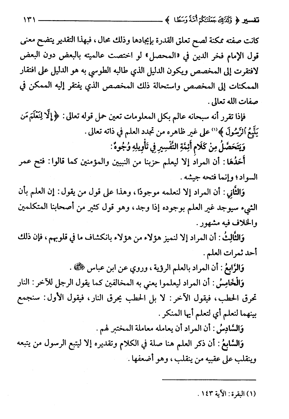 كانت صفته ممكنة لصح تعلق القدرة بإيجادها وذلك محال، فبهذا التقدير يتضح معنى قول الإِمام فخر الدين في "المحصل" لو اختصت عالميته بالبعض دون البعض لافتقرت إلى المخصص ويكون الدليل الذي طالبه الطوسي به هو الدليل على افتقار الممكنات إلى المخصص واستحالة ذلك المخصص الذي يفتقر إليه الممكن في صفات اللَّه تعالى.