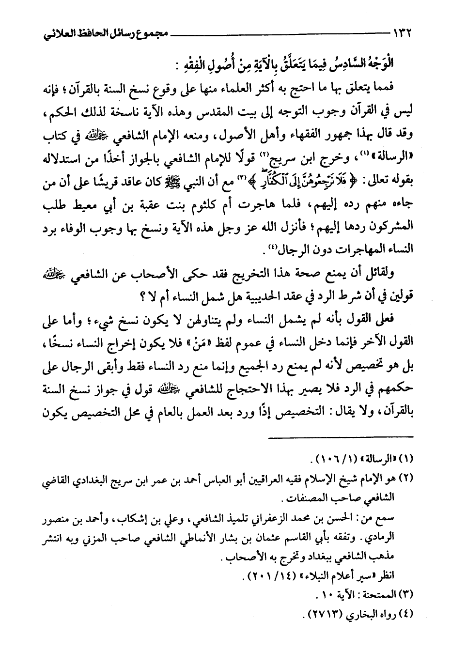 فمما يتعلق بها ما احتج به أكثر العلماء منها على وقوع نسخ السنة بالقرآن؛ فإنه ليس في القرآن وجوب التوجه إلى بيت المقدس وهذه الآية ناسخة لذلك الحكم، وقد قال بهذا جمهور الفقهاء وأهل الأصول، ومنعه الإِمام الشافعي رحمه اللَّه في كتاب "الرسالة" (¬1)، وخرج ابن سريج (¬2) قولًا للإمام الشافعي بالجواز أخذًا من استدلاله بقوله تعالى: {فَلَا تَرْجِعُوهُنَّ إِلَى الْكُفَّارِ} (¬3) مع أن النبي -صلى اللَّه عليه وسلم- كان عاقد قريشًا على أن من جاءه منهم رده إليهم، فلما هاجرت أم كلثوم بنت عقبة بن أبي معيط طلب المشركون ردها إليهم؛ فأنزل اللَّه عَزَّ وَجَلَّ هذه الآية ونسخ بها وجوب الوفاء برد النساء المهاجرات دون الرجال (¬4).