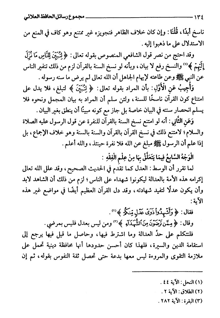 وَعَنِ الثَّانِي: أنه لو امتنع نسخ السنة بالقرآن للنفرة عن قول الرسول عليه الصلاة والسلام؟ لامتنع ذلك في نسخ القرآن بالقرآن والسنة بالسنة وهو خلاف الإجماع، بل إذا علم أن الرسول -صلى اللَّه عليه وسلم- مبلغ عن اللَّه فلا نفرة حينئذ، واللَّه أعلم.