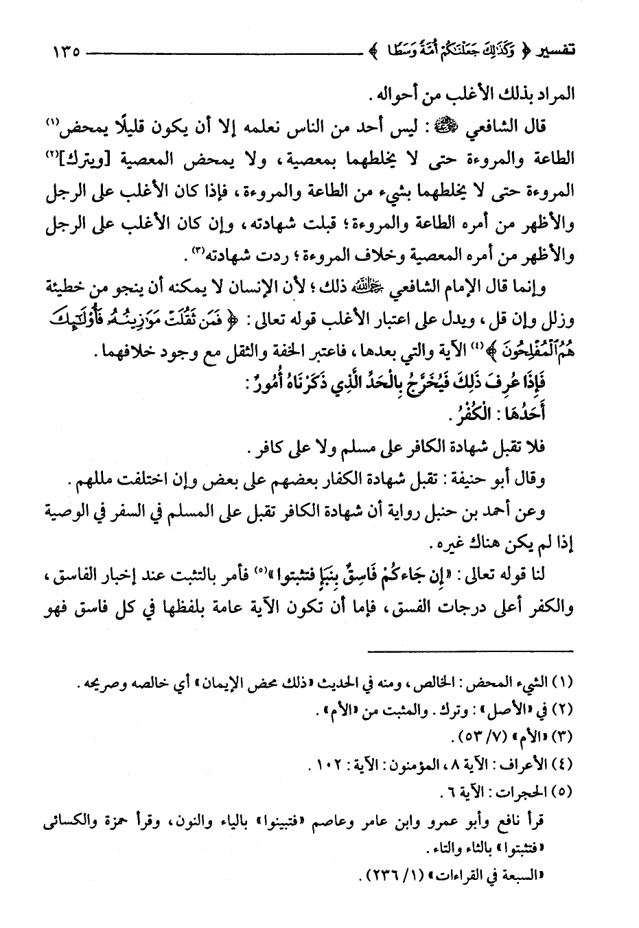 وإنما قال الإِمام الشافعي رحمه اللَّه ذلك؛ لإن الإنسان لا يمكنه أن ينجو من خطيئة وزلل وإن قل، ويدل على اعتبار الأغلب قوله تعالى: {فَمَنْ ثَقُلَتْ مَوَازِينُهُ فَأُولَئِكَ هُمُ الْمُفْلِحُونَ} (¬4) الآية والتي بعدها، فاعتبر الخفة والثقل مع وجود خلافهما.