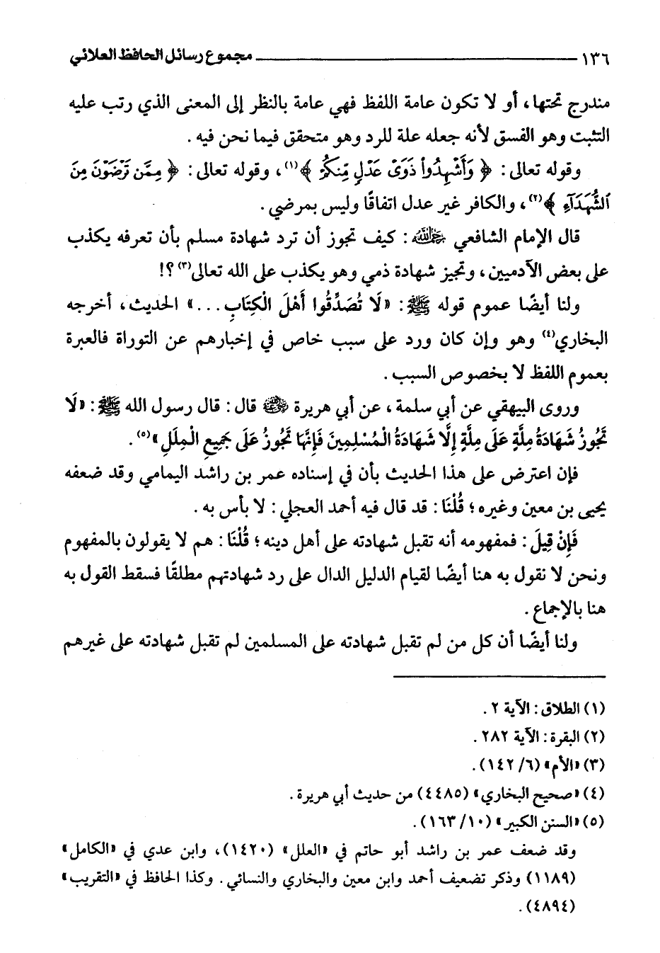 وروى البيهقي عن أبي سلمة، عن أبي هريرة -رضي اللَّه عنه- قال: قال رسول اللَّه -صلى اللَّه عليه وسلم-: "لَا تَجُوزُ شَهَادَةُ مِلَةٍ عَلَى مِلَّةِ إِلَّا شَهَادَةُ المُسْلِمِينَ فَإِنَّهَا تَجُوزُ عَلَى جَمِيعِ الْمِلَلِ" (¬5).