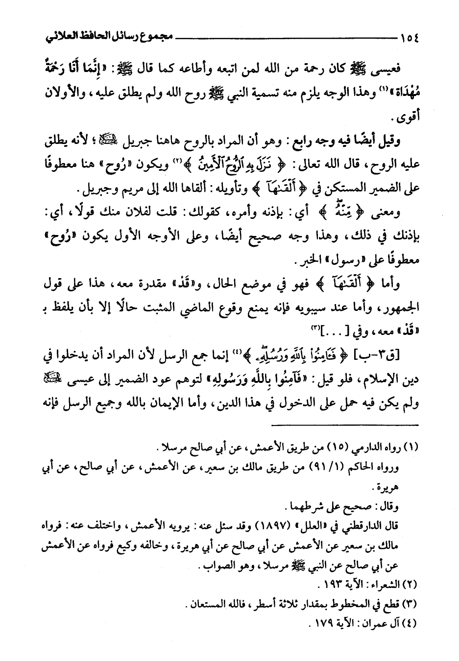 وقيل أيضًا فيه وجه رابع: وهو أن المراد بالروح ها هنا جبريل عليه السلام؛ لأنه يطلق عليه الروح، قال اللَّه تعالى: {نَزَلَ بِهِ الرُّوحُ الْأَمِينُ} (¬2) ويكون "رُوح" هنا معطوفًا على الضمير المستكن في {أَلْقَاهَا} وتأويله: ألقاها اللَّه إلى مريم وجبريل.