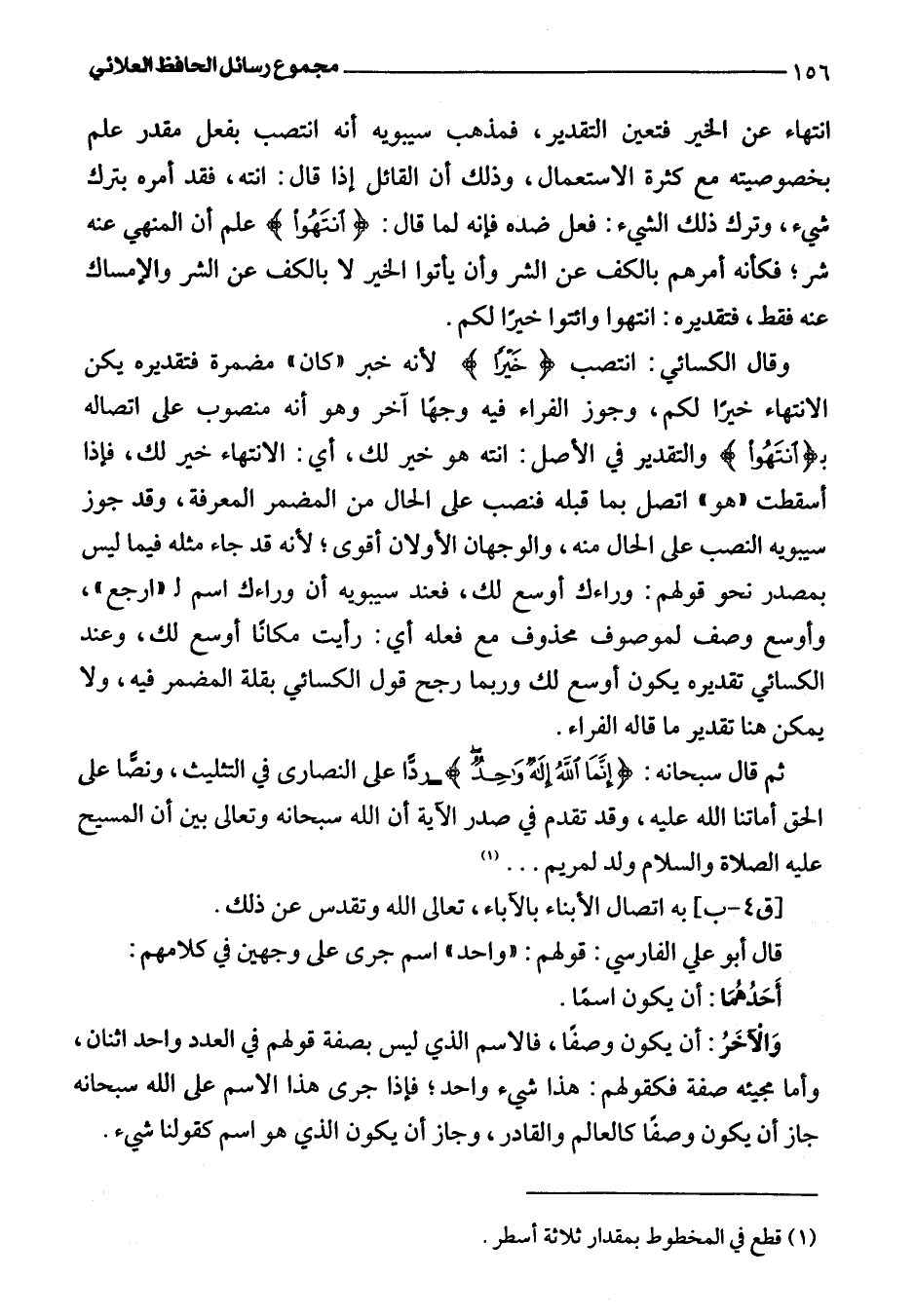 انتهاء عن الخير فتعين التقدير، فمذهب سيبويه أنه انتصب بفعل مقدر علم بخصوصيته مع كثرة الاستعمال، وذلك أن القائل إذا قال: انته، فقد أمره بترك شيء، وترك ذلك الشيء: فعل ضده فإنه لما قال: {انْتَهُوا} علم أن المنهي عنه شر؛ فكأنه أمرهم بالكف عن الشر وأن يأتوا الخير لا بالكف عن الشر والإمساك عنه فقط، فتقديره: انتهوا وائتوا خيرًا لكم.