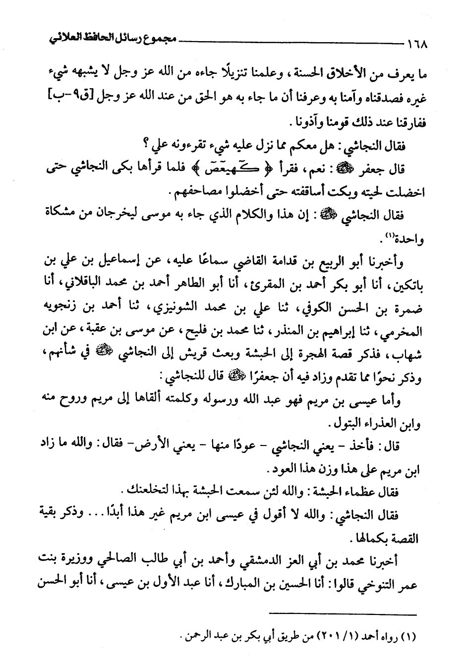 وأخبرنا أبو الربيع بن قدامة القاضي سماعًا عليه، عن إسماعيل بن علي بن باتكين، أنا أبو بكر أحمد بن المقرئ، أنا أبو الطاهر أحمد بن محمد الباقلاني، أنا ضمرة بن الحسن الكوفي، ثنا علي بن محمد الشونيزي، ثنا أحمد بن زنجويه المخرمي، ثنا إبراهيم بن المنذر، ثنا محمد بن فليح، عن موسى بن عقبة، عن ابن شهاب، فذكر قصة الهجرة إلى الحبشة وبعث قريش إلى النجاشي -رضي اللَّه عنه- في شأنهم، وذكر نحوًا مما تقدم وزاد فيه أن جعفرًا -رضي اللَّه عنه- قال للنجاشي: