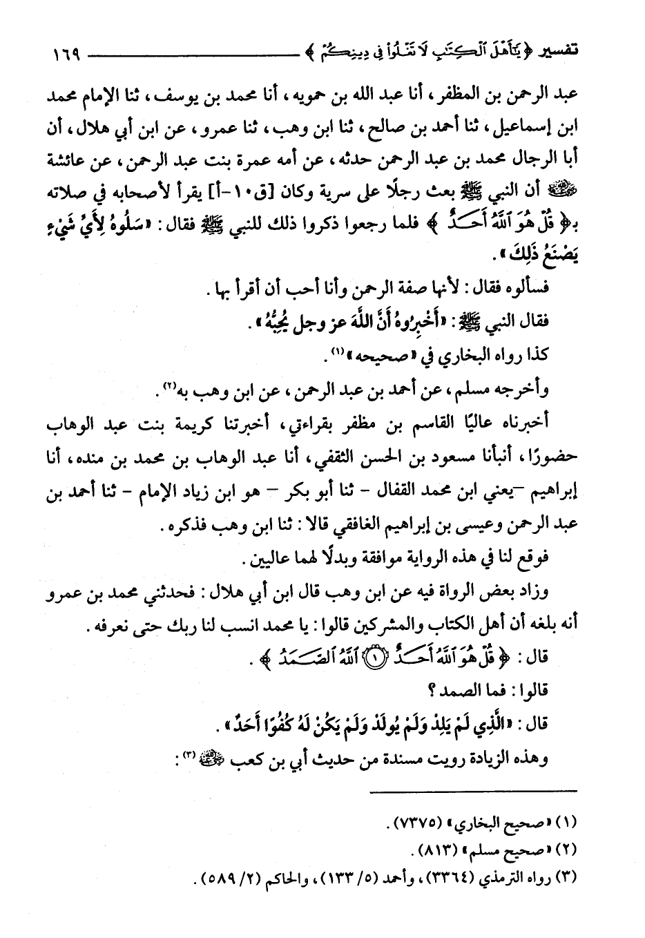 عبد الرحمن بن المظفر، أنا عبد اللَّه بن حمويه، أنا محمد بن يوسف، ثنا الإمام محمد ابن إسماعيل، ثنا أحمد بن صالح، ثنا ابن وهب، ثنا عمرو، عن ابن أبي هلال، أن أَبا الرجال محمد بن عبد الرحمن حدثه، عن أمه عمرة بنت عبد الرحمن، عن عائشة -رضي اللَّه عنها- أن النبي -صلى اللَّه عليه وسلم- بعث رجلًا على سرية وكان يقرأ لأصحابه في صلاته بـ {قُلْ هُوَ اللَّهُ أَحَدٌ} فلما رجعوا ذكروا ذلك للنبي -صلى اللَّه عليه وسلم- فقال: "سَلُوهُ لِأَيِّ شيْءٍ يَصْنعُ ذَلِكَ".