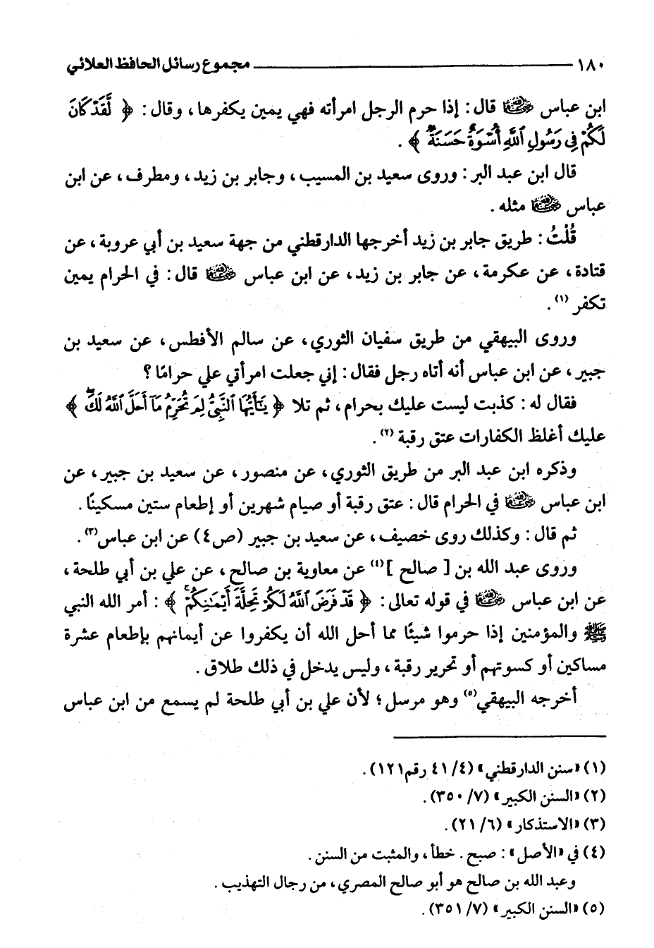 وروى البيهقي من طريق سفيان الثوري، عن سالم الأفطس، عن سعيد بن جببر، عن ابن عباس أنه أتاه رجل فقال: اني جعلت امرأتي علي حرامًا؟