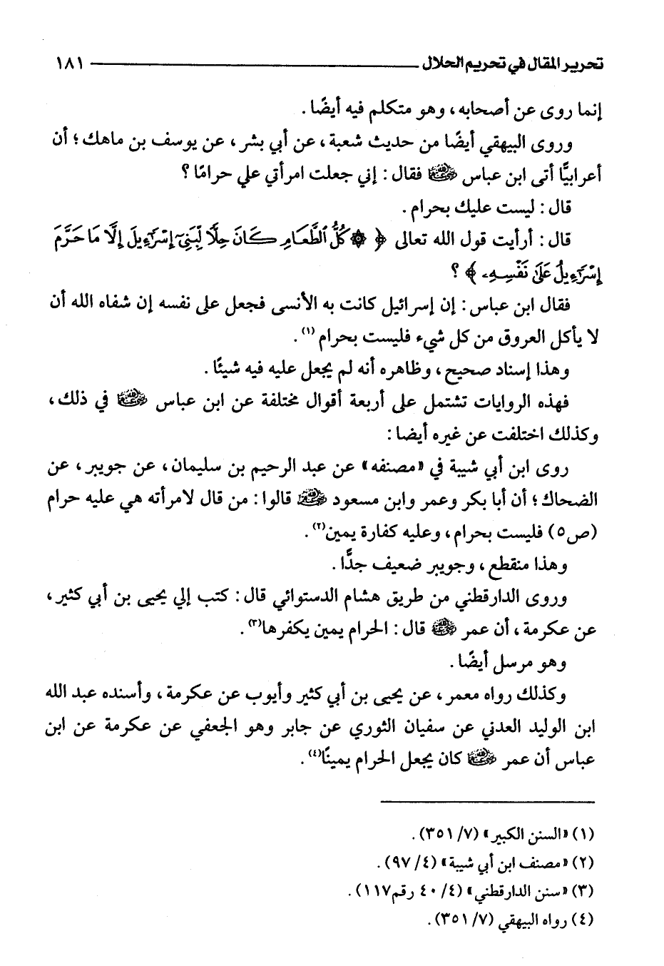 وروى البيهقي أَيضًا من حديث شعبة، عن أبي بشر، عن يوسف بن ماهك؛ أن أعرابيًّا أتى ابن عباس -رضي اللَّه عنهما- فقال: إني جعلت امرأتي على حرامًا؟