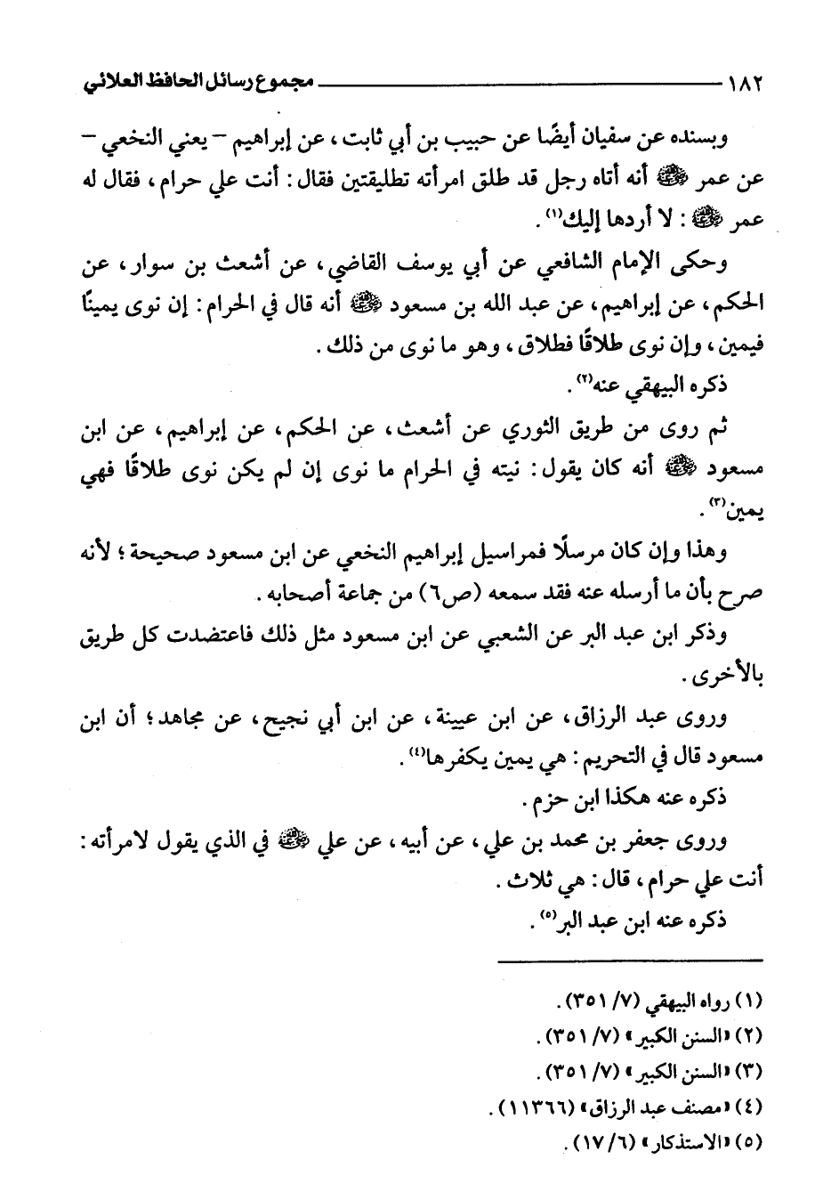 ثم روى من طريق الثوري عن أشعث، عن الحكم، عن إبراهيم، عن ابن مسعود -رضي اللَّه عنه- أنه كان يقول: نيته في الحرام ما نوى إن لم يكن نوى طلاقًا فهي يمين (¬3).