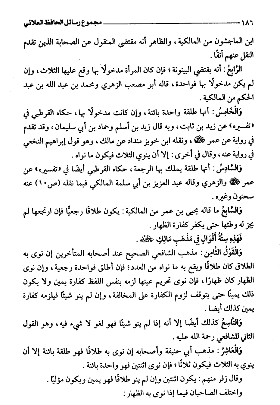 فَهَذهِ سِتَّةُ أَقوَالِ في مَذهبِ مالك رحمه اللَّه.