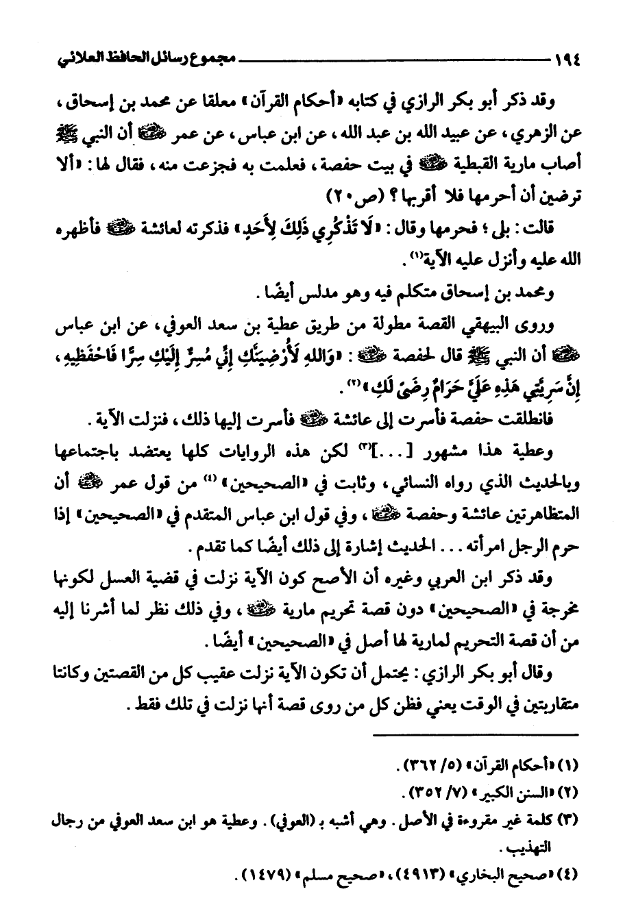 وقد ذكر أبو بكر الرازي في كتابه "أحكام القرآن" معلقًا عن محمد بن إسحاق، عن الزهري، عن عبيد اللَّه بن عبد اللَّه، عن ابن عباس، عن عمر -رضي اللَّه عنهما- أن النبي -صلى اللَّه عليه وسلم- أصاب مارية القبطية -رضي اللَّه عنها- في بيت حفصة، فعلمت به فجزعت منه، فقال لها: "ألا ترضن أن أحرمها فلا أقربها؟ (ص 20)