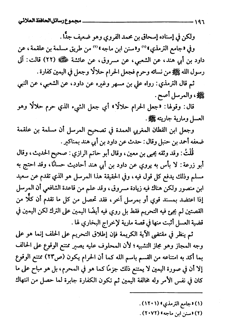 قُلْتُ: وقد وثقه يحيى بن معين، وقال أبو حاتم الرازي: صحيح الحديث، وقال أبو زرعة: لا بأس به يروي عن داود بن أبي هند أحاديث حسانًا، وقد احتج به مسلم وذلك يدفع كل قول فيه، وفي الحقيقة هذا المرسل هو الذي تقدم عن سعيد ابن منصور ولكن هناك فيه زيادة مسروق، وقد علم من قاعدة الشافعي أن المرسل إذا اعتضد بمسند قوي أو بمرسل آخر، فقد تحصل من كل ما تقدم أن كلًّا من القصتين لم يجيء فيه التحريم فقط بل روي فيه أَيضًا اليمين على الترك لكن اليمين في قضية العسل أثبت منها في قصة مارية لإخراج البخاري لها.
