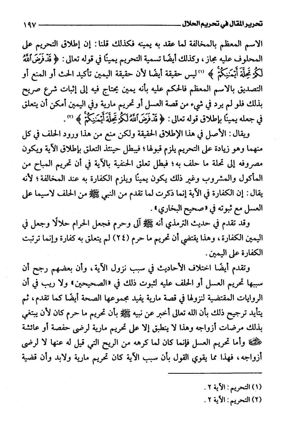 ويقال: الأصل في هذا الإطلاق الحقيقة ولكن منع من هذا ورود الحلف في كل منهما وهو زيادة على التحريم يلزم قبولها؛ فيبطل حينئذ التعلق بإطلاق الآية ويكون مصروفه إلى تحلة ما حلف به؛ فبطل تعلق الحنفية بالآية في أن تحريم المباح من المأكول والمشروب وغير ذلك يكون يمينًا ويلزم الكفارة به عند المخالفة؛ لأنه يقال: إن الكفارة في الآية إنما ذكرت لما تقدم من النبي -صلى اللَّه عليه وسلم- من الحلف لا سيما على العسل مع ثبوته في "صحيح البخاري".