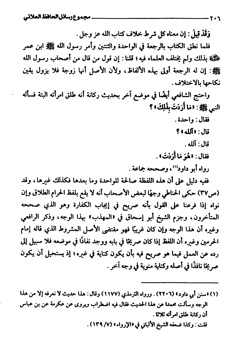 (¬1) "سنن أبي داود" (2206). ورواه الترمذي (1177) وقال: هذا حديث لا نعرفه إلا من هذا الوجه وسألت محمدًا عن هذا الحديث فقال فيه اضطراب ويروى عن عكرمة عن ابن عباس أن ركانة طلق امرأته ثلاثا.