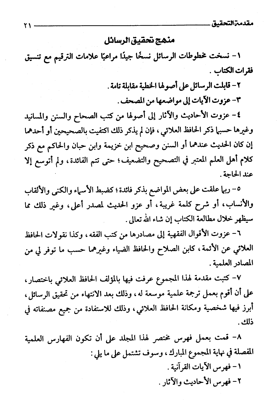 7 - كتبت مقدمة لهذا المجموع عرفت فيها بالمؤلف الحافظ العلائي باختصار، على أن أقوم بعمل ترجمة علمية موسعة له، وذلك بعد الانتهاء من تحقيق الرسائل، أبرز فيها شخصية ومكانة الحافظ العلائي، وذلك للاستفادة من جميع مصنفاته في ذلك.