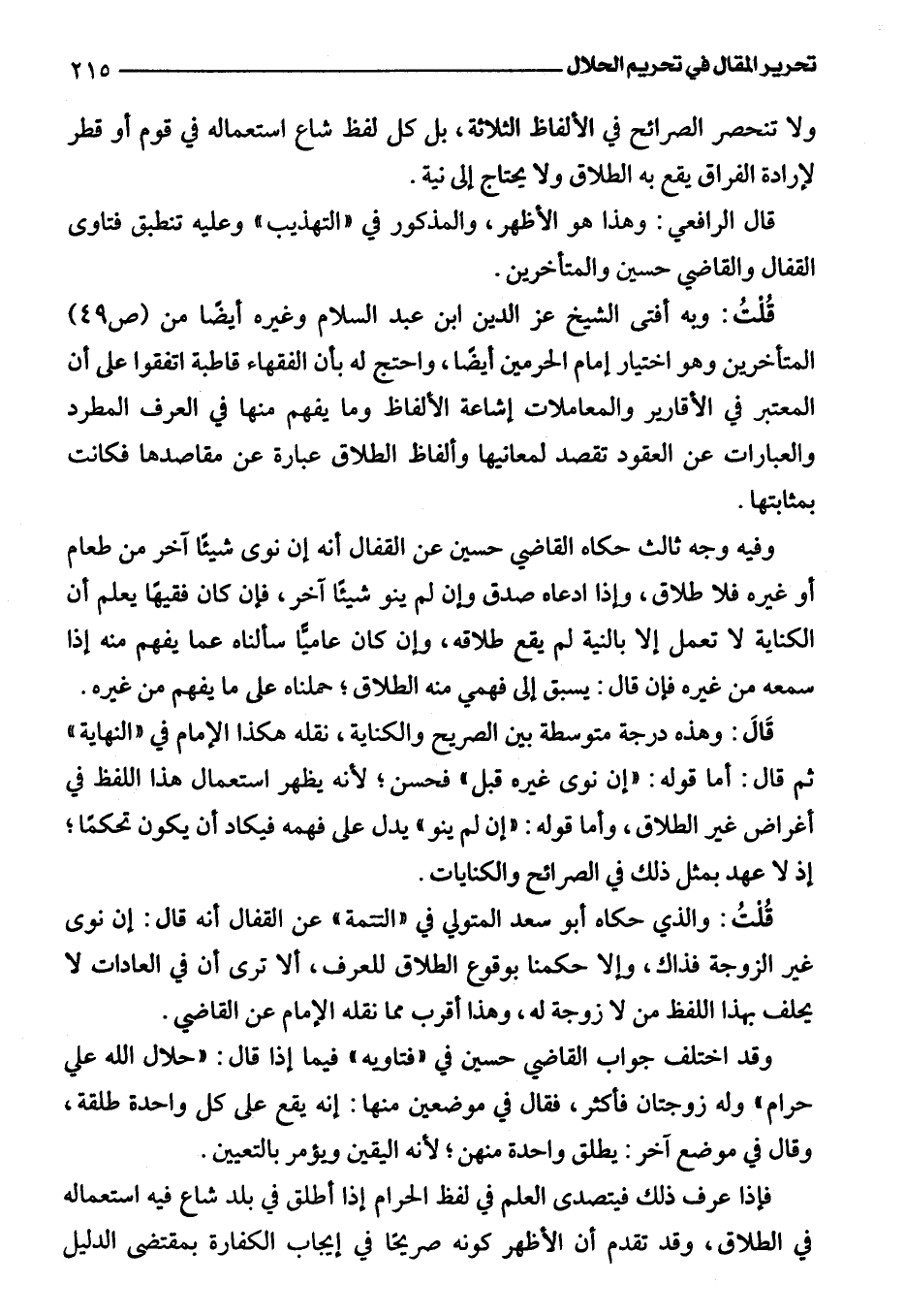 قُلْتُ: وبه أفتى الشيخ عز الدين ابن عبد السلام وغيره أيضًا من (ص 49) المتأخرين وهو اختيار إمام الحرمين أيضًا، واحتج له بأن الفقهاء قاطبة اتفقوا على أن المعتبر في الأقارير والمعاملات إشاعة الألفاظ وما يفهم منها في العرف المطرد والعبارات عن العقود تقصد لمعانيها وألفاظ الطلاق عبارة عن مقاصدها فكانت بمثابتها.