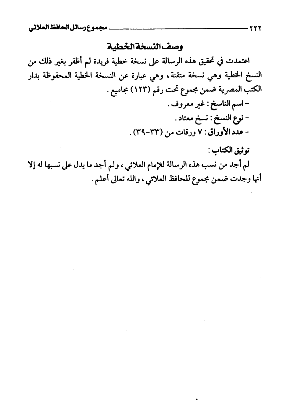 لم أجد من نسب هذه الرسالة للإمام العلائي، ولم أجد ما يدل على نسبها له إلا أنها وجدت ضمن مجموع للحافظ العلائي، واللَّه تعالى أعلم.