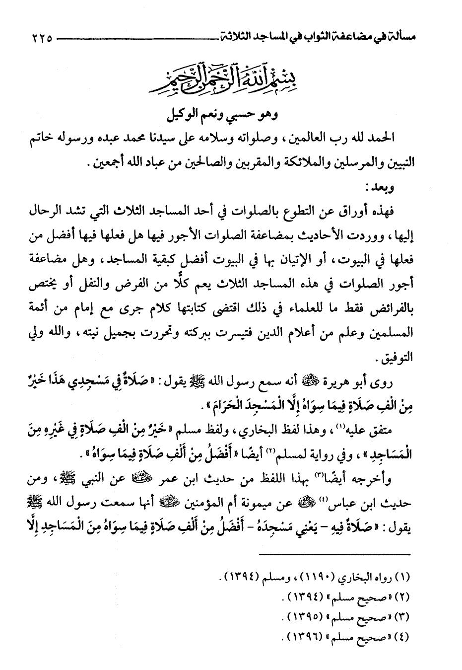 فهذه أوراق عن التطوع بالصلوات في أحد المساجد الثلاث التي تشد الرحال إليها، ووردت الأحاديث بمضاعفة الصلوات الأجور فيها هل فعلها فيها أفضل من فعلها في البيوت، أو الإتيان بها في البيوت أفضلٍ كبقية المساجد، وهل مضاعفة أجور الصلوات في هذه المساجد الثلاث يعم كلًّا من الفرض والنفل أو يختص بالفرائض فقط ما للعلماء في ذلك اقتضى كتابتها كلام جرى مع إمام من أئمة المسلمين وعلم من أعلام الدين فتيسرت ببركته وتحررت بجميل نيته، واللَّه ولي التوفيق.