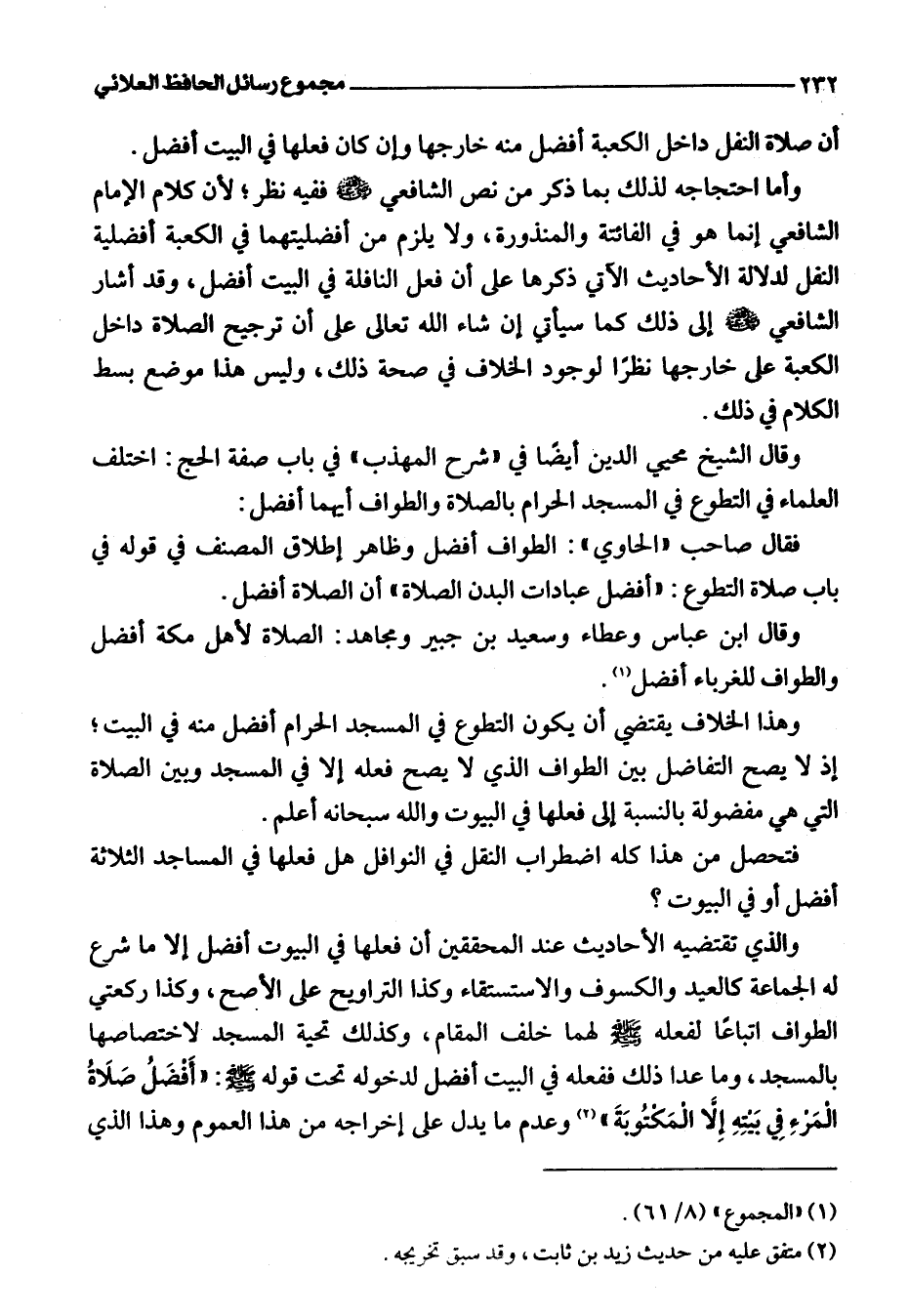وقال الشيخ محيي الدين أيضًا في "شرح المهذب" في باب صفة الحج: اختلف العلماء في التطوع في المسجد الحرام بالصلاة والطواف أيهما أفضل: