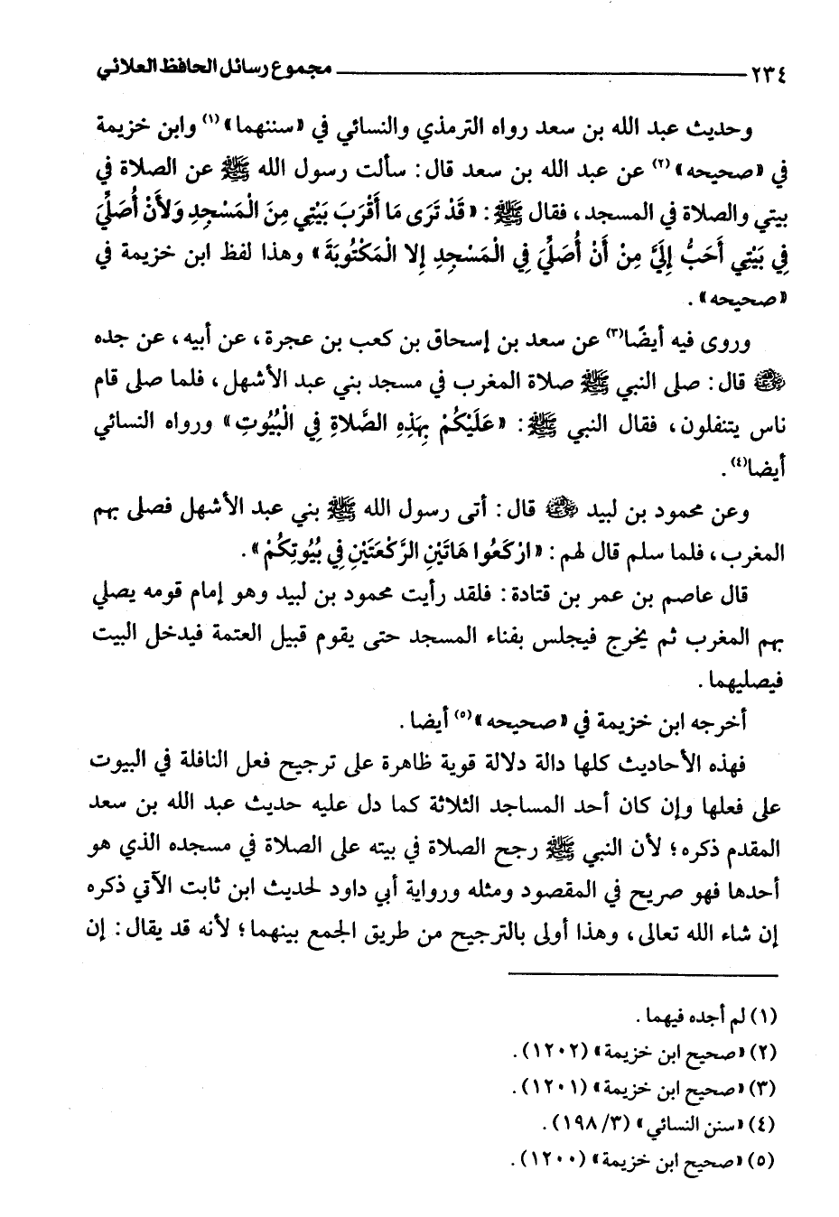 فهذه الأحاديث كلها دالة دلالة قوية ظاهرة على ترجيح فعل النافلة في البيوت على فعلها وإن كان أحد المساجد الثلاثة كما دل عليه حديث عبد اللَّه بن سعد المقدم ذكره؛ لأن النبي -صلى اللَّه عليه وسلم- رجح الصلاة في بيته على الصلاة في مسجده الذي هو أحدها فهو صريح في المقصود ومثله ورواية أبي داود لحديث ابن ثابت الآتي ذكره إن شاء اللَّه تعالى، وهذا أولى بالترجيح من طريق الجمع بينهما؛ لأنه قد يقال: إن
