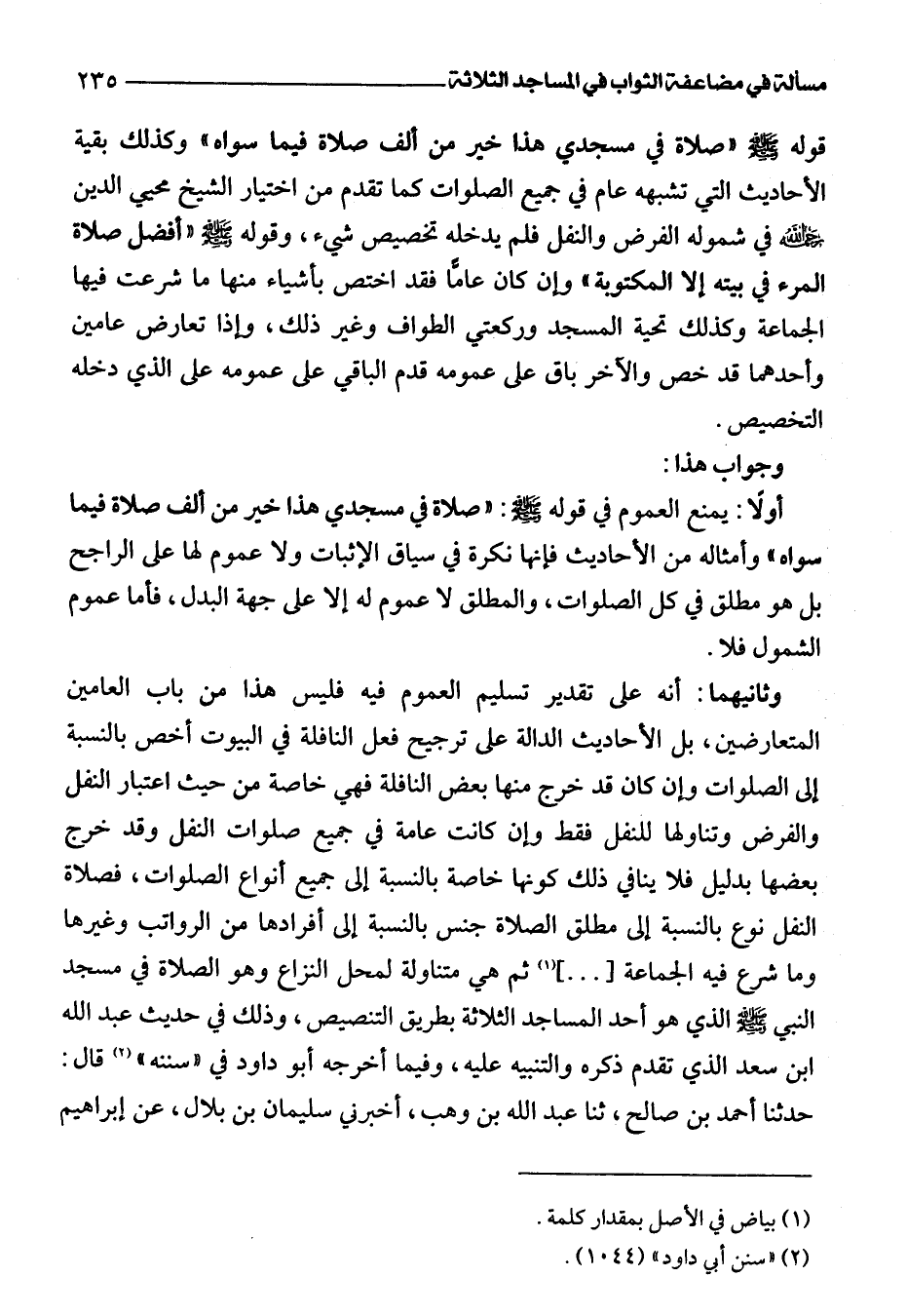 وثانيهما: أنه على تقدير تسليم العموم فيه فليس هذا من باب العامين المتعارضين، بل الأحاديث الدالة على ترجيح فعل النافلة في البيوت أخص بالنسبة إلى الصلوات وإن كان قد خرج منها بعض النافلة فهي خاصة من حيث اعتبار النفل والفرض وتناولها للنفل فقط وإن كانت عامة في جميع صلوات النفل وقد خرج بعضها بدليل فلا ينافي ذلك كونها خاصة بالنسبة إلى جميع أنواع الصلوات، فصلاة النفل نوع بالنسبة إلى مطلق الصلاة جنس بالنسبة إلى أفرادها من الرواتب وغيرها وما شرع فيه الجماعة [. . .] (¬1) ثم هي متناولة لمحل النزاع وهو الصلاة في مسجد النبي -صلى اللَّه عليه وسلم- الذي هو أحد المساجد الثلاثة بطريق التنصيص، وذلك في حديث عبد اللَّه ابن سعد الذي تقدم ذكره والتنبيه عليه، وفيما أخرجه أبو داود في "سننه" (¬2) قال: حدثنا أحمد بن صالح، ثنا عبد اللَّه بن وهب، أخبرني سليمان بن بلال، عن إبراهيم