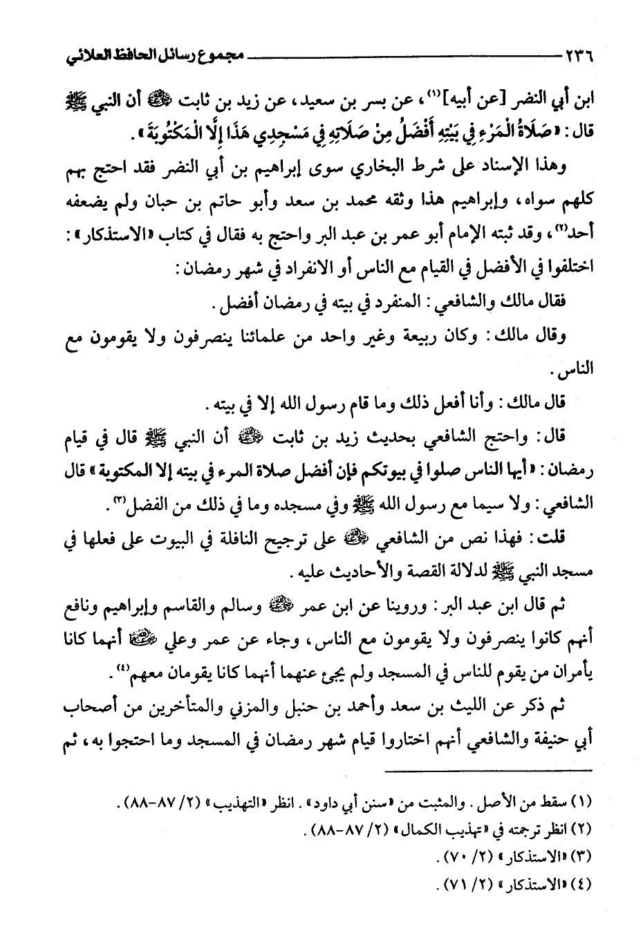 قال: واحتج الشافعي بحديث زيد بن ثابت -رضي اللَّه عنه- أن النبي -صلى اللَّه عليه وسلم- قال في قيام رمضان: "أيها الناس صلوا في بيوتكم فإن أفضل صلاة المرء في بيته الا المكتوبة" قال الشافعي: ولا سيما مع رسول اللَّه -صلى اللَّه عليه وسلم- وفي مسجده وما في ذلك من الفضل (¬3).
