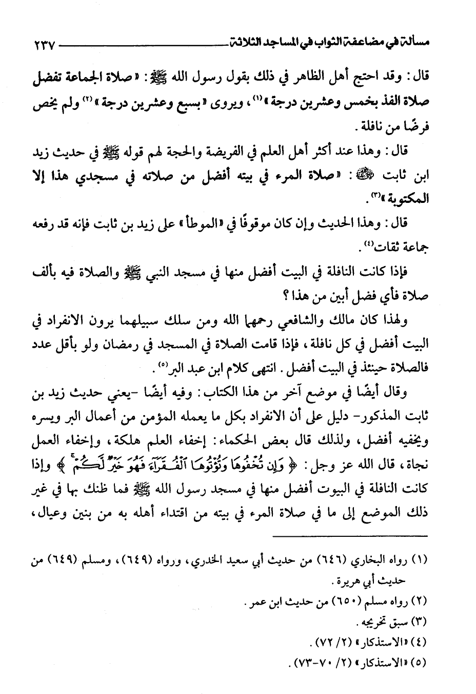 وقال أيضًا في موضع آخر من هذا الكتاب: وفيه أيضًا -يعني حديث زيد بن ثابت المذكور- دليل على أن الانفراد بكل ما يعمله المؤمن من أعمال البر ويسره ويخفيه أفضل، ولذلك قال بعض الحكماء: إخفاء العلم هلكة، وإخفاء العمل نجاة، قال اللَّه عز وجل: {وَإِنْ تُخْفُوهَا وَتُؤْتُوهَا الْفُقَرَاءَ فَهُوَ خَيْرٌ لَكُمْ} وإذا كانت النافلة في البيوت أفضل منها في مسجد رسول اللَّه -صلى اللَّه عليه وسلم- فما ظنك بها في غير ذلك الموضع إلى ما في صلاة المرء في بيته من اقتداء أهله به من بنين وعيال،
