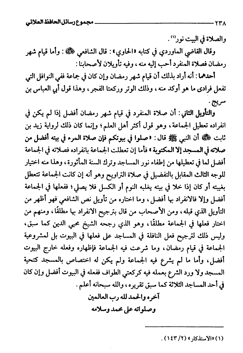 وقال القاضي الماوردي في كتابه "الحاوي": قال الشافعي -رضي اللَّه عنه-: وأما قيام شهر رمضان فصلاة المنفرد أحب إليه منه، وفيه تأويلان لأصحابنا: