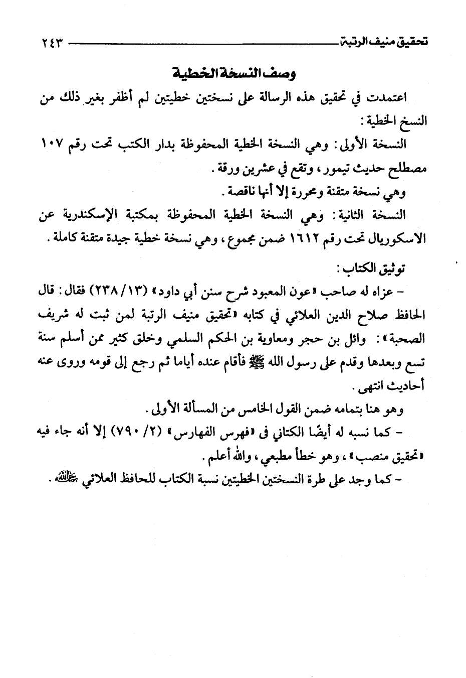 -كما وجد على طرة النسختين الخطيتين نسبة الكتاب للحافظ العلائي رحمه اللَّه.