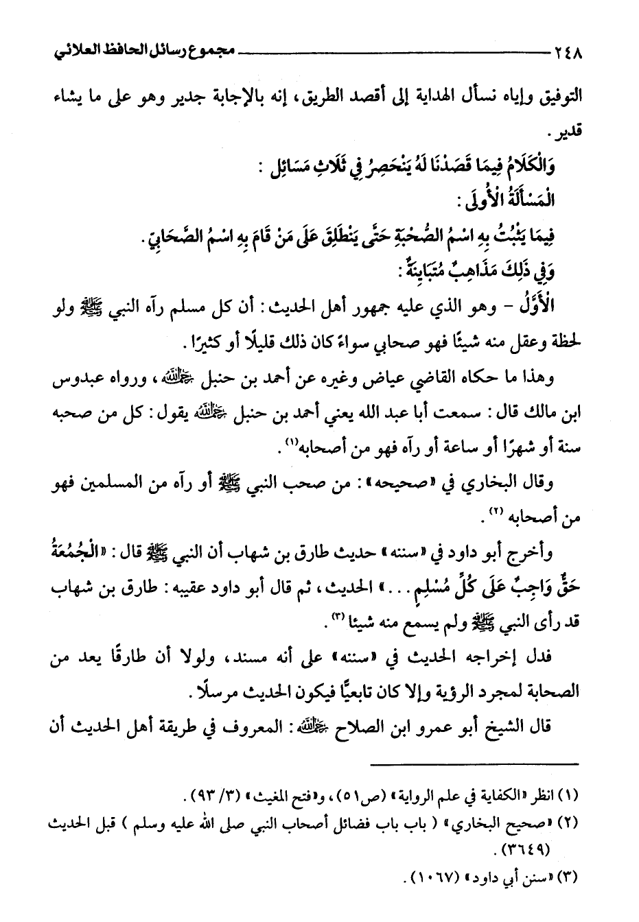 الْمَسْأَلَةُ الأُولَى: فِيمَا يَثْبُتُ بِهِ اسْمُ الصُّحْبَةِ حَتَّى يَنْطَلِقَ عَلَى مَنْ قَامَ بِهِ اسْمُ الصَّحَابِيّ.